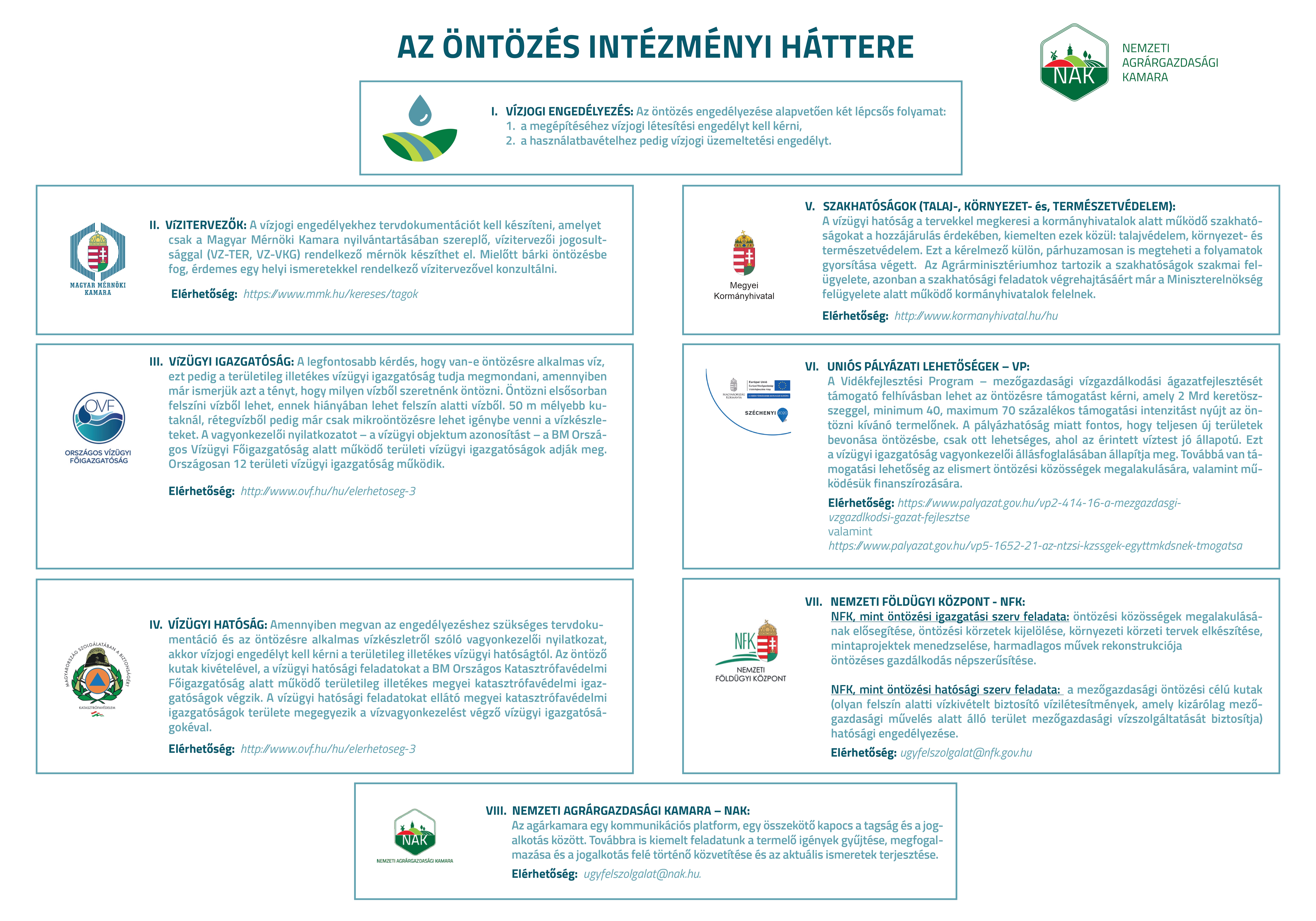 A NAK által készített tájékoztató útmutató bemutatja az öntözés engedélyezésében résztvevő tervezőket, hatóságokat, igazgatóságokat, valamint intézményeket.