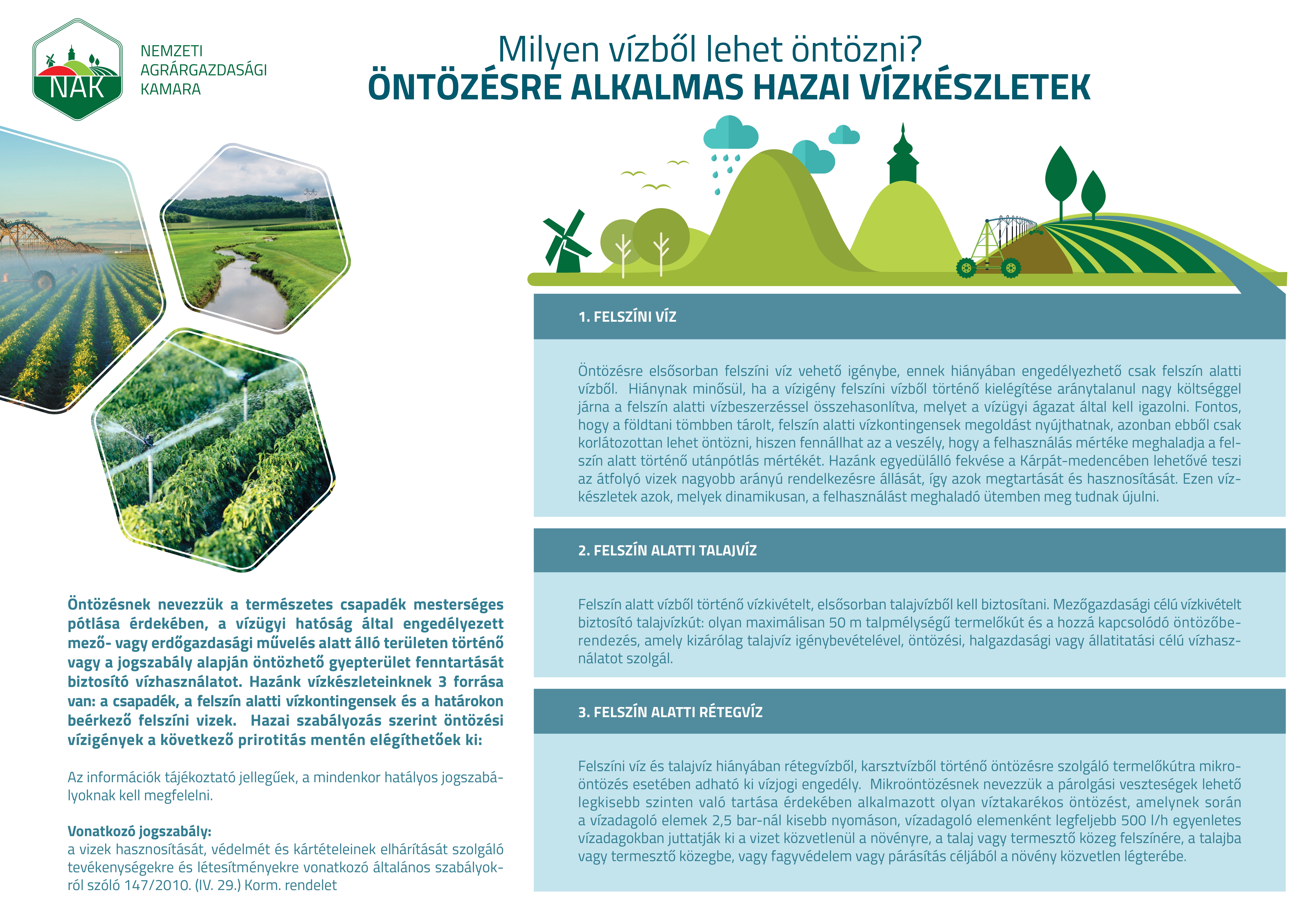 A természetes csapadék mesterséges pótlása érdekében, a vízügyi hatóság által engedélyezett mező- vagy erdőgazdasági művelés alatt álló területen történő, vagy a jogszabály alapján öntözhető gyepterület fenntartását biztosító vízhasználat számít öntözésnek. Az öntözésre alkalmas hazai vízkészleteket ismerteti a NAK legújabb információs ábrája.