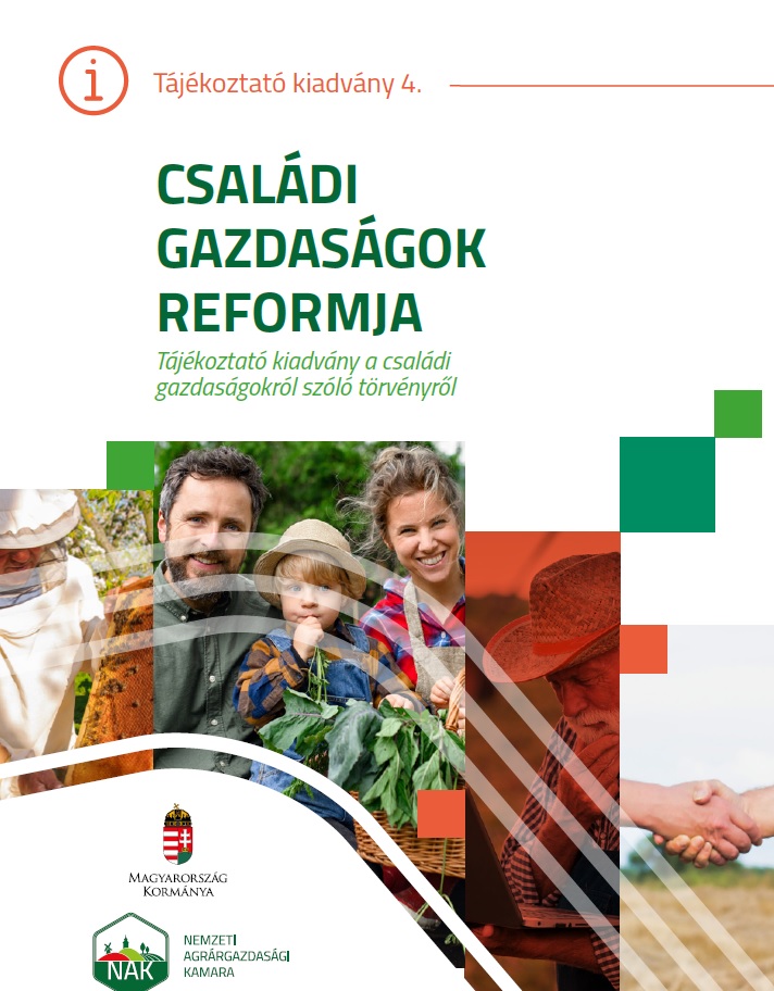 Tájékoztató kiadvány 4. -  A családi gazdaságokról szóló törvény (2020. évi CXXIII. törvény) szabályai 2021. január 1-jén lépnek hatályba. A Nemzeti Agrárgazdasági Kamara kezdeményezésére megszületett törvény jelentős összefogás eredménye mind a gazdálkodókkal, mind a jogalkotásban részt vevő minisztériumokkal.  Az egyeztetések és a jogszabályalkotási munka eredményeképpen kidolgozott, és az Országgyűlés által elfogadott törvény a 21. századi elvárásoknak megfelelő működési és adózási környezetet teremt, elősegítve az agrár- és élelmiszeripari gazdaságok fejlődését, fejlesztését, valamint a generációváltást, mindeközben csökkentve az adminisztrációs terheket is. Jelen kiadvány a mezőgazdasági működési formák reformjáról, valamint a hozzájuk kapcsolódó adózási szabályokról ad információkat. A kiadványban ismertetett szabályok, illetve változások az ágazat működésének versenyképességét, hatékonyságát hivatottak elősegíteni. Jelentőségük elvitathatatlan, hiszen várhatóan hosszú évekre meghatározhatják az agrárium fejlődését. Az összeállított anyag a későbbiek során még kiegészülhet a végrehajtási rendeletben megjelentekkel.