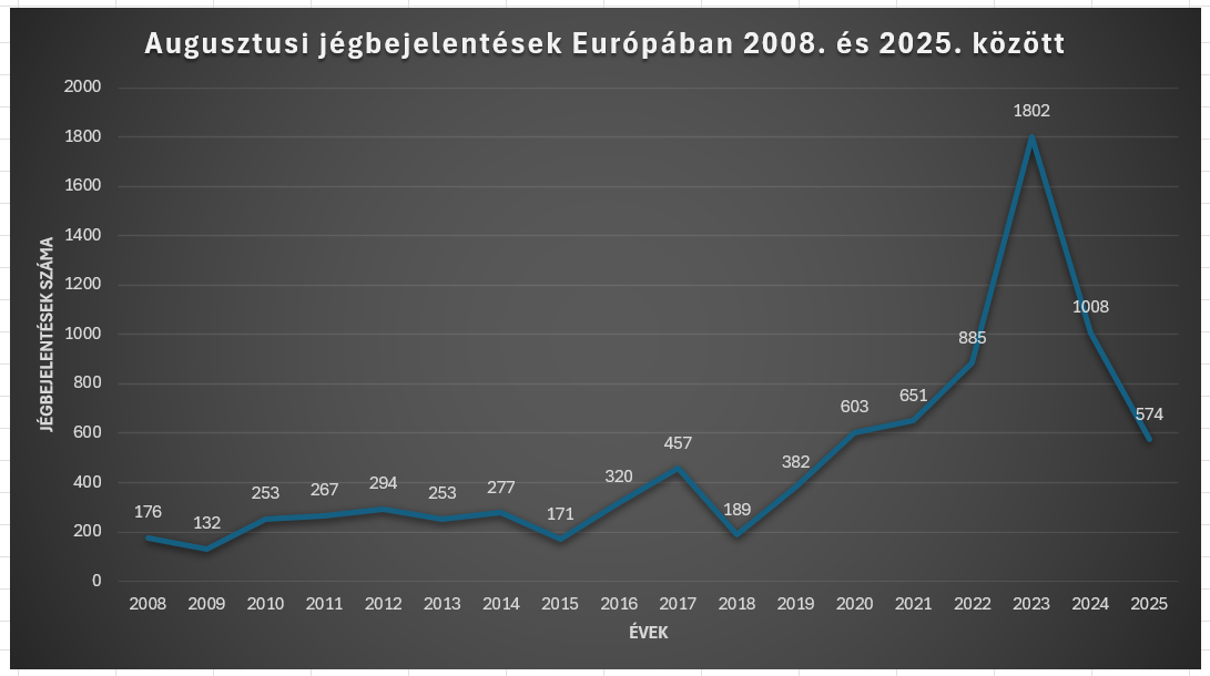 A hónap nem csak Magyarországon, hanem Európában is extrém időjárási eseményeket hozott. Európa több régióját ismét aszály sújtotta, amit a tartós hőhullámok és átlag alatti csapadékot eredményezett. Az ESWD adatbázis alapján az elmúlt 17 év időtávlatában 2025. augusztusban történt a 6. legtöbb jégbejelentés. Mindennek az az oka, hogy a tartós hőhullám, így az aszály következtében sokkal kevesebb jégveszélyes zivatar tudott kialakulni augusztusban.
