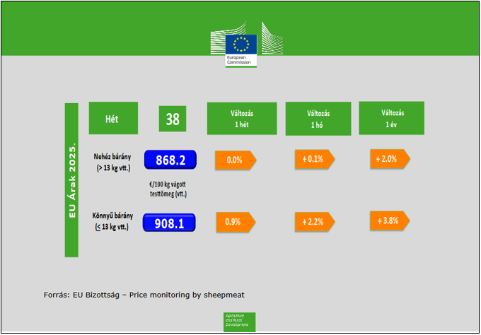 A nehéz bárány átlagára az EU-ban a 2025. szeptember 21-vel végződő 38. héten 868,2 euró/100 kg vt. (vt. = vágott testtömeg), a könnyű bárány átlagára pedig 908,1 euró/100 kg vt. volt. A nehéz bárányár nem változott, a könnyű bárányár esetében pedig 0,9%-os emelkedés volt tapasztalható az egy héttel korábban rögzített értékekhez képest (37. heti árak: nehéz bárány átlagár 868,2 euró/100 kg vt., könnyű bárány átlag 900,4 euró/100 kg vt.).