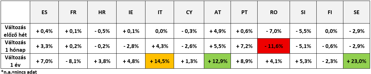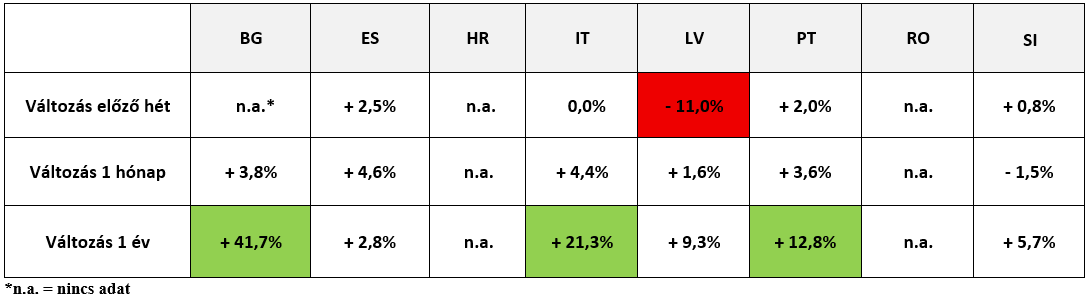 A 38. héten a könnyű bárány ár tekintetében Bulgáriára, Horvátországra és Romániára vonatkozóan adat nem áll rendelkezésre, Olaszországban pedig az árak nem változtak.