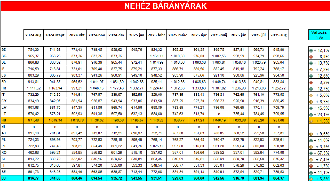 Az Európai Unióban a nehéz bárányárak átlagos értéke 2025 augusztusában 864,37 euró/100 kg vt. volt. (Magyarország tekintetében ez az érték pedig 981,68 euró/100 kg vt. volt.)