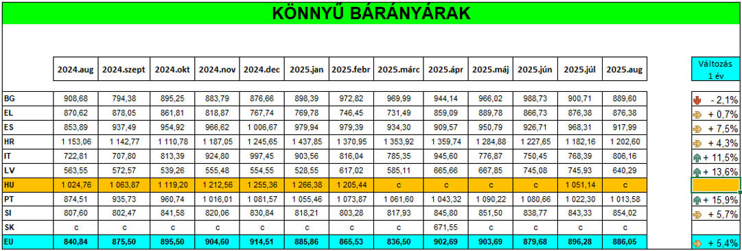 Az Európai Unióban a könnyű bárányárak átlagos értéke 2025 augusztusában 886,05 euró/100 kg vt. volt. (Magyarországra vonatkozóan adat nem áll rendelkezésre.)