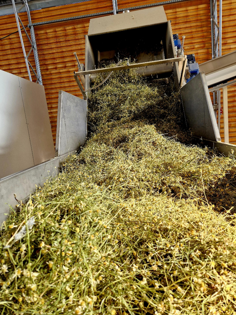 A kamilla gyűjtése nemcsak Magyarországon, de a szomszédos országokban, így Horvátországban is csökkenő tendenciát mutat, így egyre meghatározóbb a növény termesztése. Üzemi méretekben a betakarításához elengedhetetlen a kamilla kombájn, vagy speciális betakarítógép használata (1. kép).  Az üzemlátogatás során megtekintett traktorra szerelhető kamillabetakarító nemcsak kamilla, de kis átalakítással más levelükért termesztett gyógynövénykultúrák (pl.: citromfű, menta, csalán) betakarítására is használható. A virágok eltávolítására szolgáló rotor egy ferde szállítószalagra helyezi a virágokat, amely a kamillát egy garatba juttatja. A vágóasztal magasságának módosításával a kamilla mellett más virágok, pl.: körömvirág betakarítására is alkalmas a berendezés.