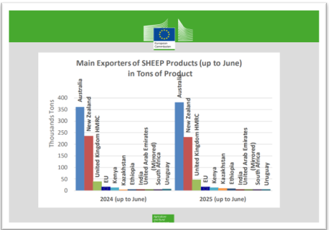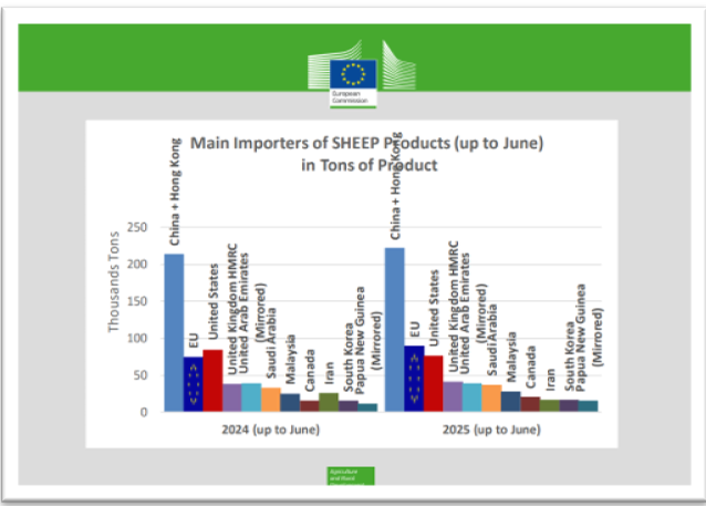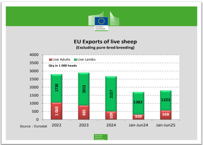 Az EU juh- és a kecskehús, valamint élő állat kivitele 2025 első félévében 54 616 tonna vt. (vt. = vágott testtömeg) volt, mely összesen 481 millió Euro értéket képviselt. A kivitel mennyisége 3 514 tonna vt. értékkel (6,8%), értéke pedig 80 millió Euro-val (19,95%) emelkedett az előző év azonos időszakához viszonyítva.
